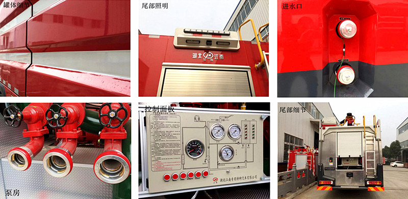 駕駛室頂部前端為長排警燈,車身后配有24V/60W火場照明燈一只,車輛兩側(cè)上方各配有紅藍(lán)相配的爆閃燈,下方安裝安全標(biāo)志燈,乘員室、器材箱、 泵房內(nèi)均裝有照明燈,加裝有100W警報(bào)器,回轉(zhuǎn)警燈開關(guān)、通訊設(shè)備預(yù)備接口。