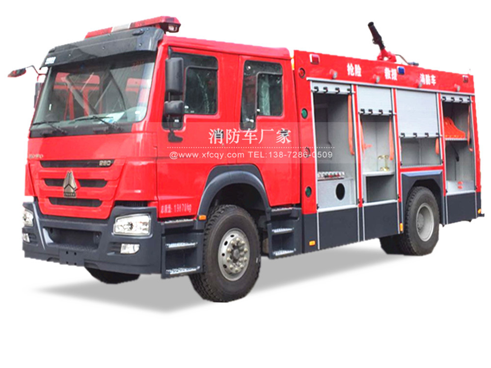 水罐消防車由底盤,乘員室,泵房,容罐,器材箱,水泵及管路,消防水炮,取力傳動裝置,附加電器,消防器材及固定裝置等組成,起重泵房,器材箱可采用整體式結構,也可采用分體式結構。