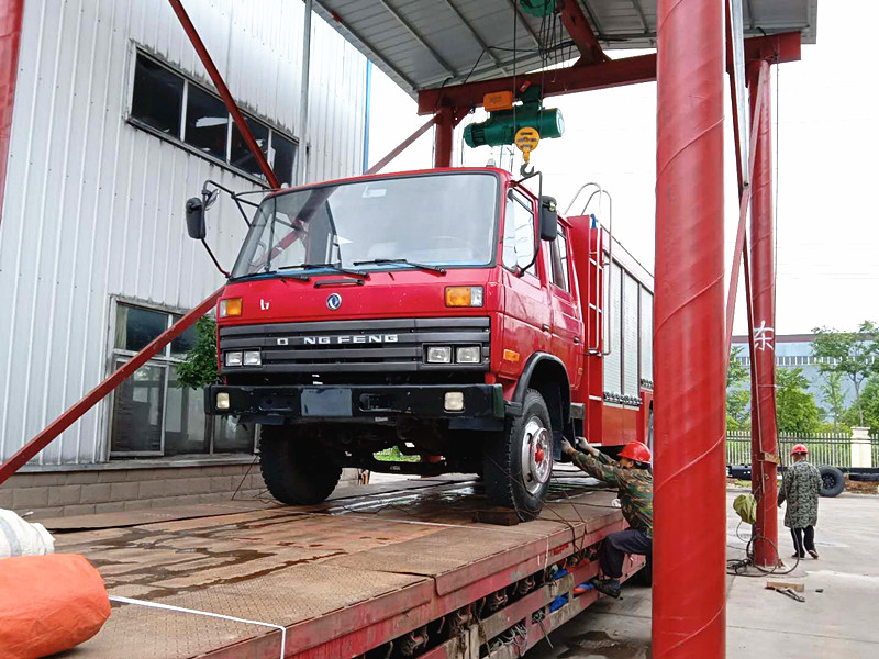 圖片為:兩臺東風(fēng)救援消防車陸續(xù)開上平板車。發(fā)往目的地