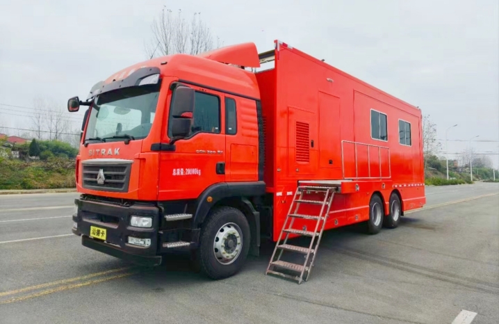 我公司生產(chǎn)的通信指揮車基于汕德卡ZZ5266XXYN504GF1K型廂式運輸底盤改裝,該底盤變速箱為手動變速箱,最高車速89km/h,發(fā)動機型號為MC07H.35-60,發(fā)動機排量:7360ml,排放國Ⅵ標準。消防通信指揮車以汕德卡ZZ5266XXYN504GF1K型廂式運輸底盤作為改裝平臺,保證工作人員擁有寬敞舒適的工作環(huán)境,并且為系統(tǒng)的運行和維護提供符合技術(shù)要求的環(huán)境條件。在保持整車優(yōu)良性能的前提下對車輛進行改裝而成,實現(xiàn)符合用戶使用要求的工作環(huán)境、使用功能而量身定制的特種專用車輛。消防通信指揮車具備通信組網(wǎng)功能和指揮通信與情報信息采集功能。通過高清晰、低照度車載云臺攝像機,可實現(xiàn)全天候、多方位、大范圍的現(xiàn)場監(jiān)控功能。通過車載硬盤錄像機,可以對現(xiàn)場的情況進行適時錄像、錄音記錄,以便日后進行調(diào)查,并可通過USB接口及數(shù)據(jù)端口與其他存儲設(shè)備相連接,進行現(xiàn)場刻錄,便于錄像資料的及時、有效保存。車載液晶電視可集中顯示系統(tǒng)采集到的信息,便于領(lǐng)導(dǎo)實時掌握事發(fā)現(xiàn)場的各種情況,可以及時指揮調(diào)度,正確決策。
